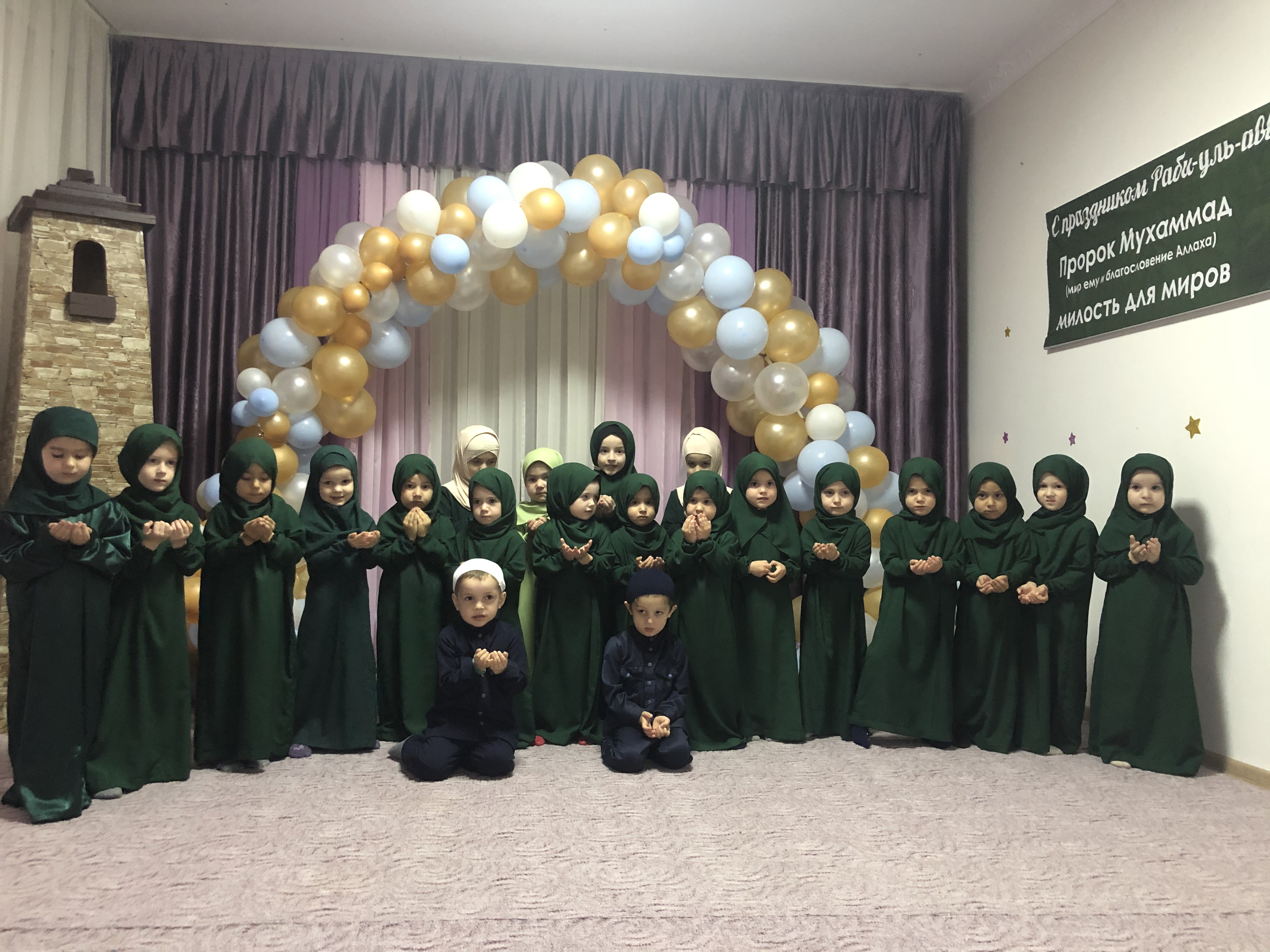 21.11.2019В МБДОУ "Детский сад №2 "Малыш" с.Алхазурово" прошло мероприятие посвящённое великому празднику рождения Пророка Мухьммада (с.а.с) Раби уль-авваль с ноября этого года мусульмане в различных странах мира празднуют день рождения Пророка Мухаммада (мир ему и благословения). Этот день общепринято называть Муалидом.Муалид празднуют в разных странах и городах по-своему. Одни мусульмане собираются вместе, чтобы прослушать лекцию о жизнеописании Пророка Мухаммаде (мир ему и благословение) другие же устраивают угощения специально приготовленной едой и сладостями и.т.д.Вот и мы решили провести в нашем детском саду мероприятии, посвященные Дню рождения Пророка Мухаммада (мир ему и благословение). Цель: развитие духовно-нравственных качеств у детей дошкольного возраста. Иметь представление о религии Ислам, иметь первоначальное представление о ней. О необходимости знаний об Исламе.К этому знаменательному Дню в ДОУ по плану был оформлен фасад здания, музыкальный зал.В нашем саду 21 ноября 2019г. прошел утренник, посвященный Дню рождения Пророка Мухаммада (мир ему и благословение). Дети читали стихи пели нашиты – восхваления Пророка Мухаммада (мир ему и благословение).Родители и дети были очень довольны. Проводя такие мероприятия, надеемся, что детям больше запечатлеться в их памяти и это послужит им примером духовного воспитания.В течение месяца Раби-уль-авваль были прочитаны несколько тысячи салаватов детьми и работниками ДОУ. Ведь в хадисе говорится: «Тому, кто прочтет мне один салават, Всевышний прочтет десять салаватов, освободит его от десяти зол и поднимет его на десять уровней»